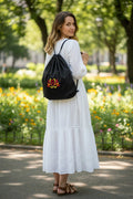 Discover the charm and functionality of the “Esta” bag by Mystika Arts and Crafts, designed with the essence of natural elegance for the Slovak market. Esta is not just a bag; it is a piece of art created to enrich your daily travels with a touch of mysticism. With beautiful lotus-inspired embroidery in vibrant red, orange and yellow hues, this black canvas drawstring bag combines simplicity with a significant design that symbolizes harmony, renewal and inner peace.