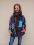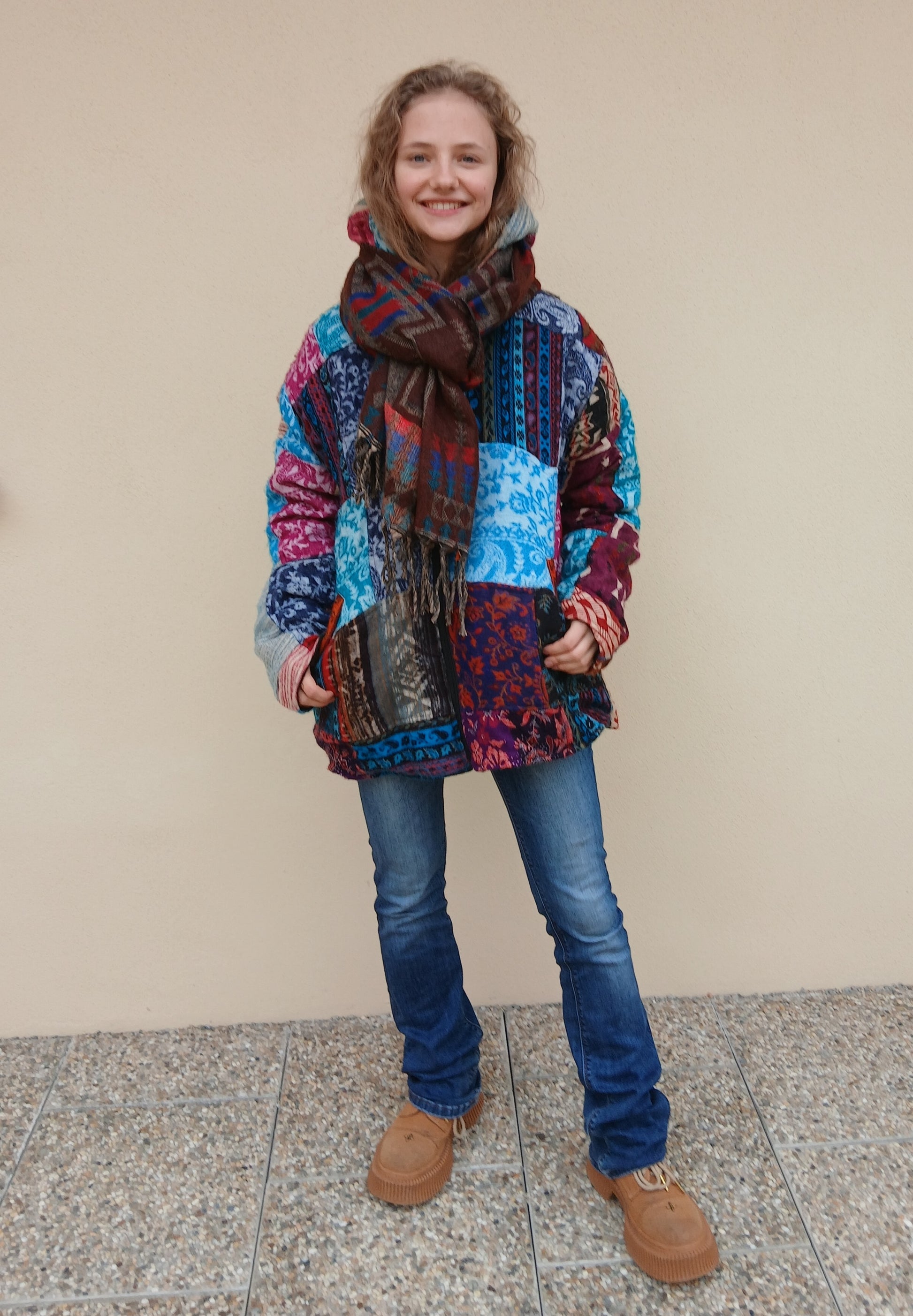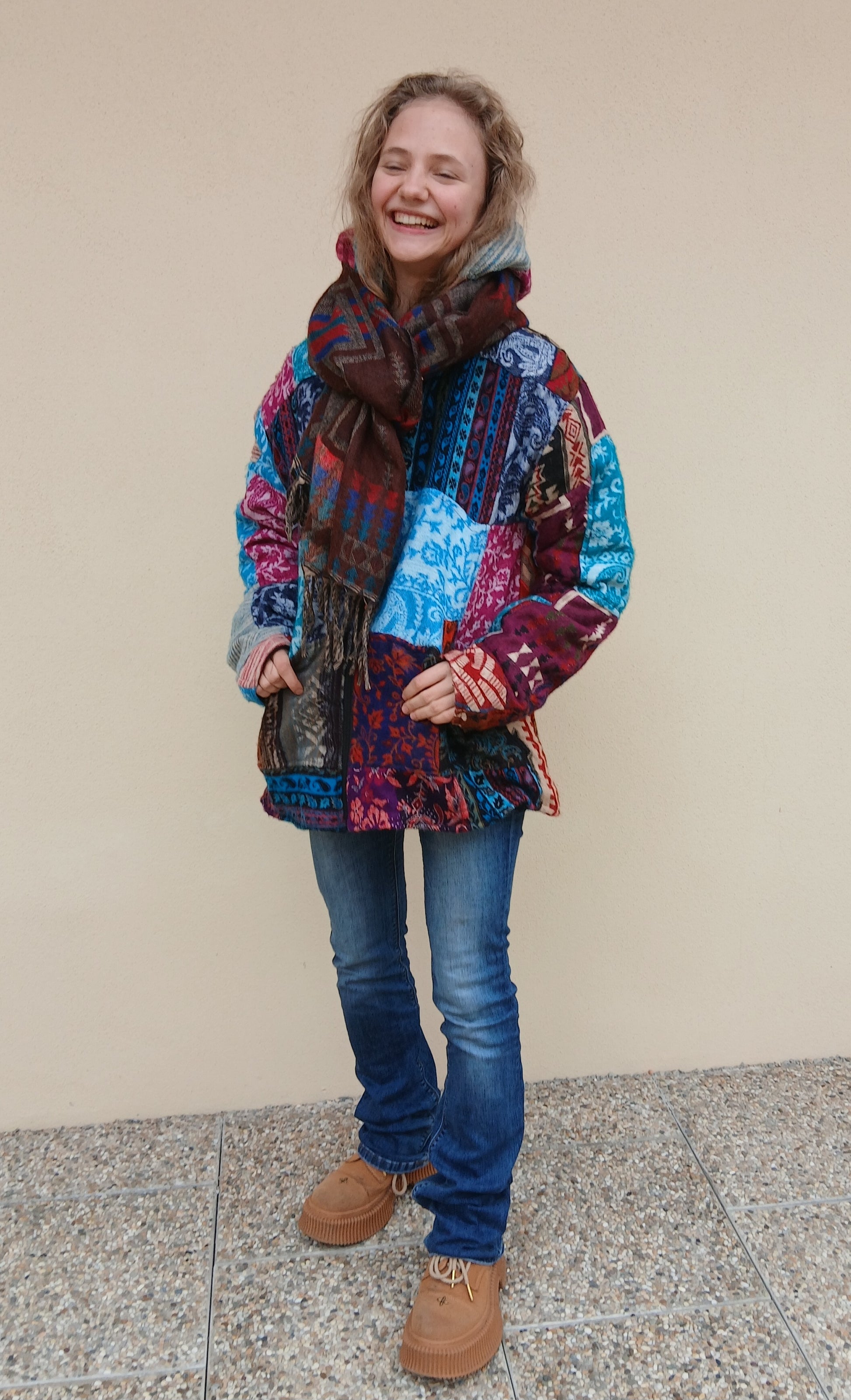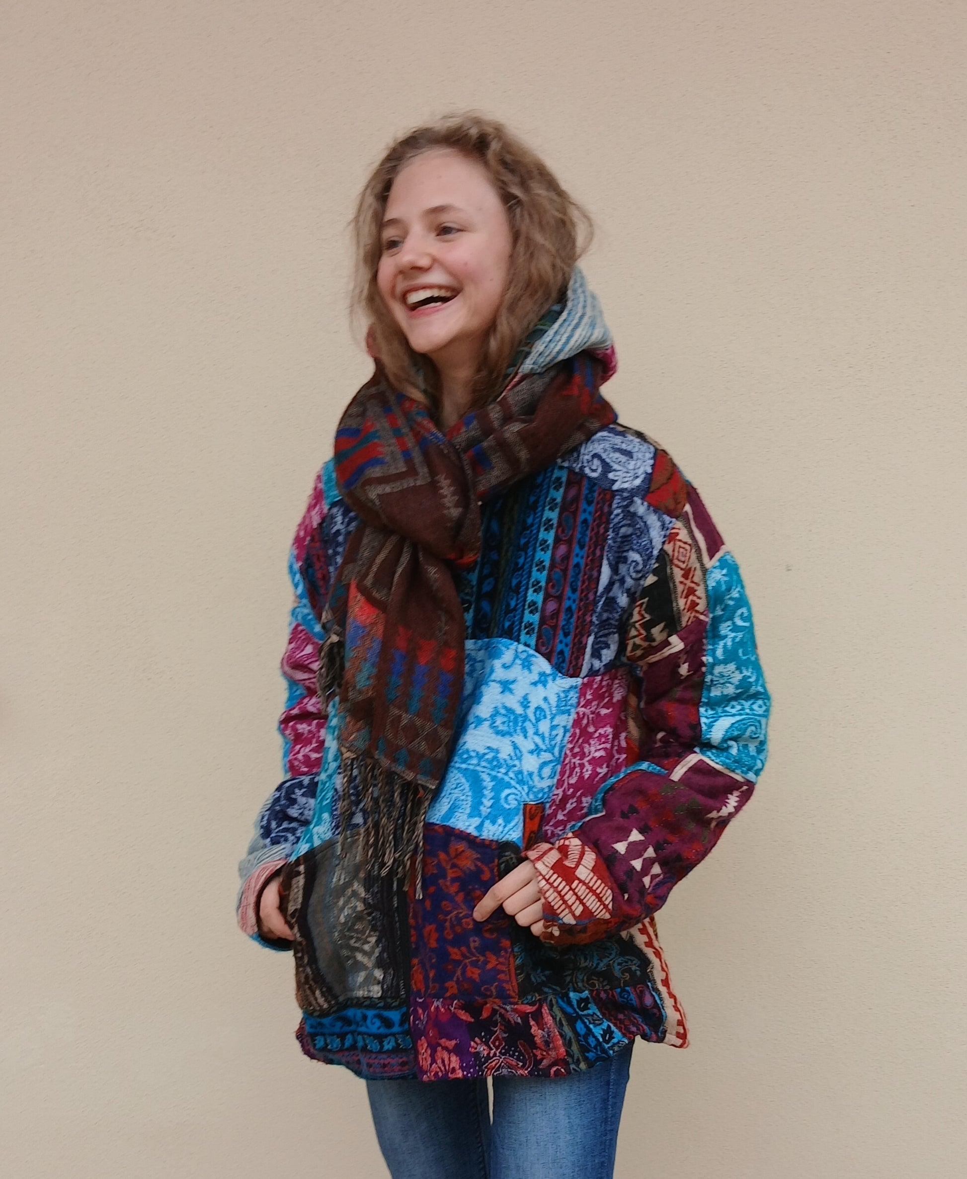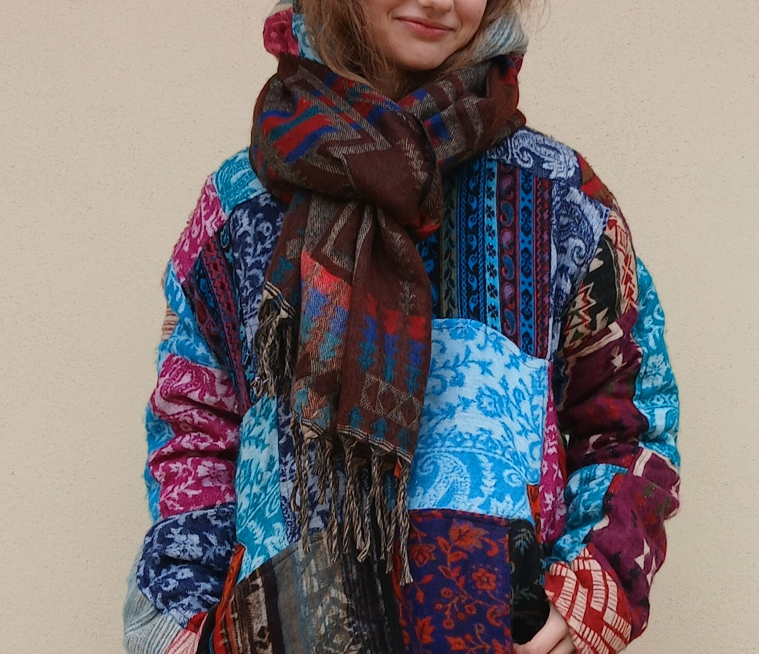 Táto zimná bunda vyrobená z kvalitnej Akrylovej vlny a podšitá hrejivým flísom je dokonalou kombináciou pohodlia, funkčnosti a štýlu. Ručná práca z Indie zaručuje jedinečný dizajn a vysokú kvalitu spracovania. Bunda je zdobená farebnými ručnými maľbami, ktoré odrážajú hippy a etno štýl, obľúbený medzi milovníkmi alternatívnej módy. Jasné farby a originálne vzory robia z tejto bundy nielen praktický, ale aj výrazný módny doplnok na zimu. Flísová podšívka zabezpečuje príjemné teplo počas chladných dní, zatiaľ čo bavlnený povrch je odolný a pohodlný. Tento unikátny kúsok je perfektnou voľbou pre každého, kto hľadá kvalitu a štýl s nádychom tradície a originality.