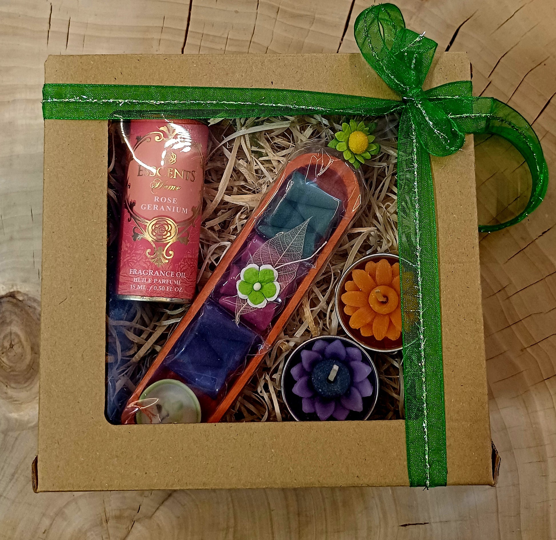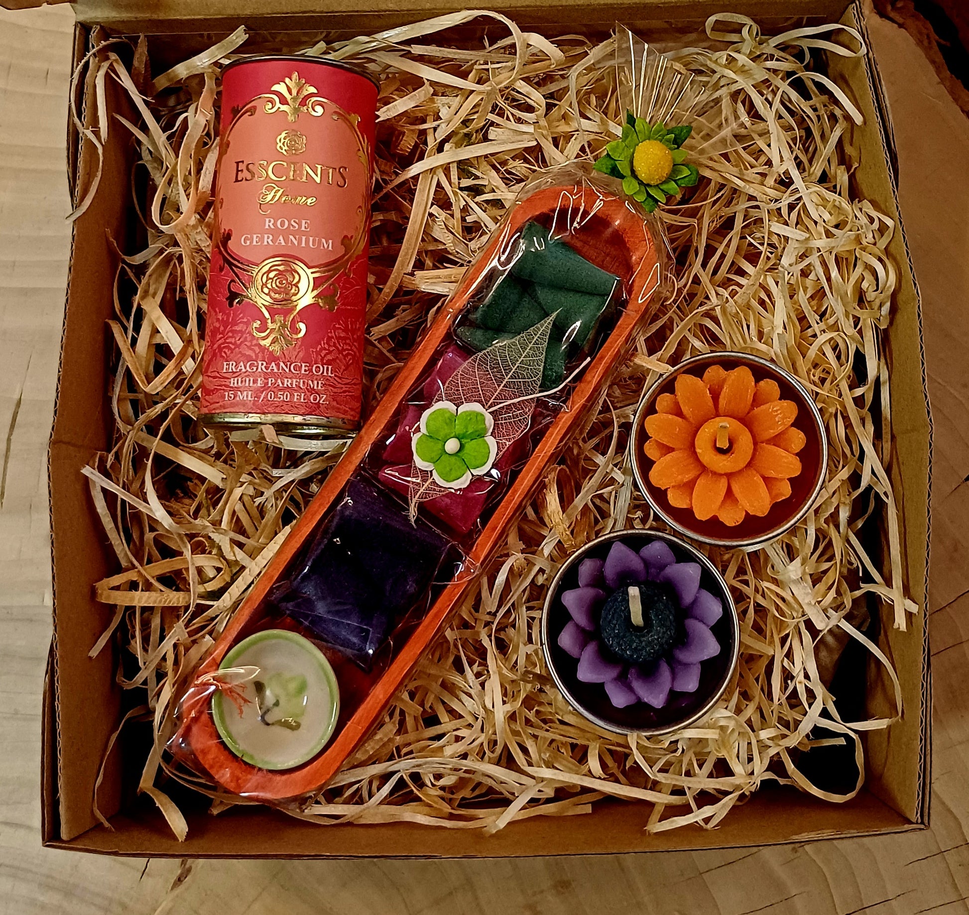 Malá darčeková krabička pre veľkú radosť. Krabička obsahuje darčekové balenie 12 kusov vonných kuželí s vôňou levandule a keramickú mištičku na vonné kužele v drevenej vaničke, 1 x vonný olej 15 ml s vôňou ruže zabalený v darčekovej plechovke a 2 x čajovú sviečku. Ideálny darček pre chvílky pokoja a relaxu.