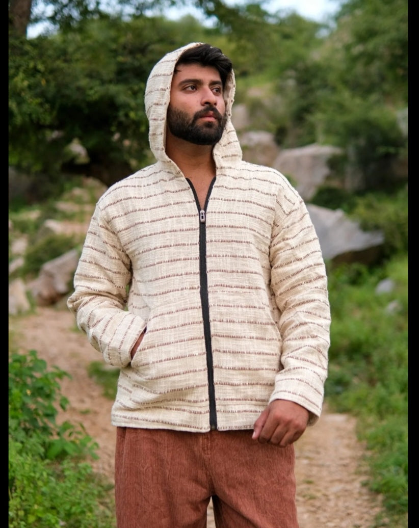 Vychutnajte si pocit pohodlia a štýlu s bundičkou Nomad, Je ideálnym kúskom pre každého, kto túži po každodennom pohodlí a zároveň chce byť vždy originálny. Bundička je vyrobená z kvalitnej tkanej vzdušnej bavlny a svojím dizajnom predstavuje dokonalé spojenie prírody a štýlu. Dostupná je v krémovej farbe, zdobená horizontálnymi pruhmi, čo jej dodáva rustikálny, autentický vzhľad. Priestranná kapucňa, zapínanie na zips a bočné vrecká robia z tejto bundičky ideálny kúsok na každodenné nosenie počas celého roku. Unisex