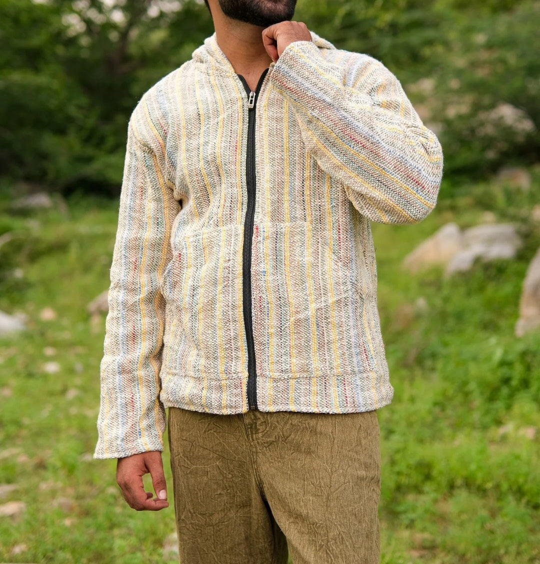 Bunda Indira je dokonalým spojením pohodlia a štýlu. Je vyrobená z kvalitnej ručne tkanej bavlny s jemným pruhovaným vzorom v príjemných pastelových farbách. Bunda Indira je ľahká no zároveň príjemne hrejivá, čo z nej robí ideálny kúsok v chladnom aj zimnom období. Bundička disponuje dvomi vreckami po bokoch, zipsom a kapucňou. Či sa chystáte do prírody, na festival, alebo len tak na prechádzku mestom, táto bunda bude vašim obľúbeným boho kúskom. Unisex