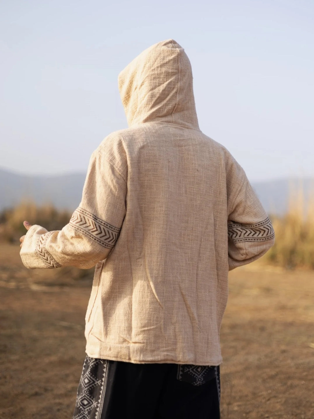 Bunda Yuva je dokonalou kombináciou bohémskeho štýlu a nadčasovej elegancie. Táto bunda je vyrobená z vysoko kvalitnej bavlnenej látky a je doplnená jedinečnou ručne vyrobenou blokovou potlačou, čo z nej robí kúsok vhodný pre každú príležitosť. Bunda je dostupná v príjemnej béžovej farbe, ktorá sa skvelo kombinuje s akýmkoľvek iným oblečením. Bunda disponuje kapucňou, zipsom a dvomi praktickými vreckami a je vhodná pre mužov aj ženy. Unisex