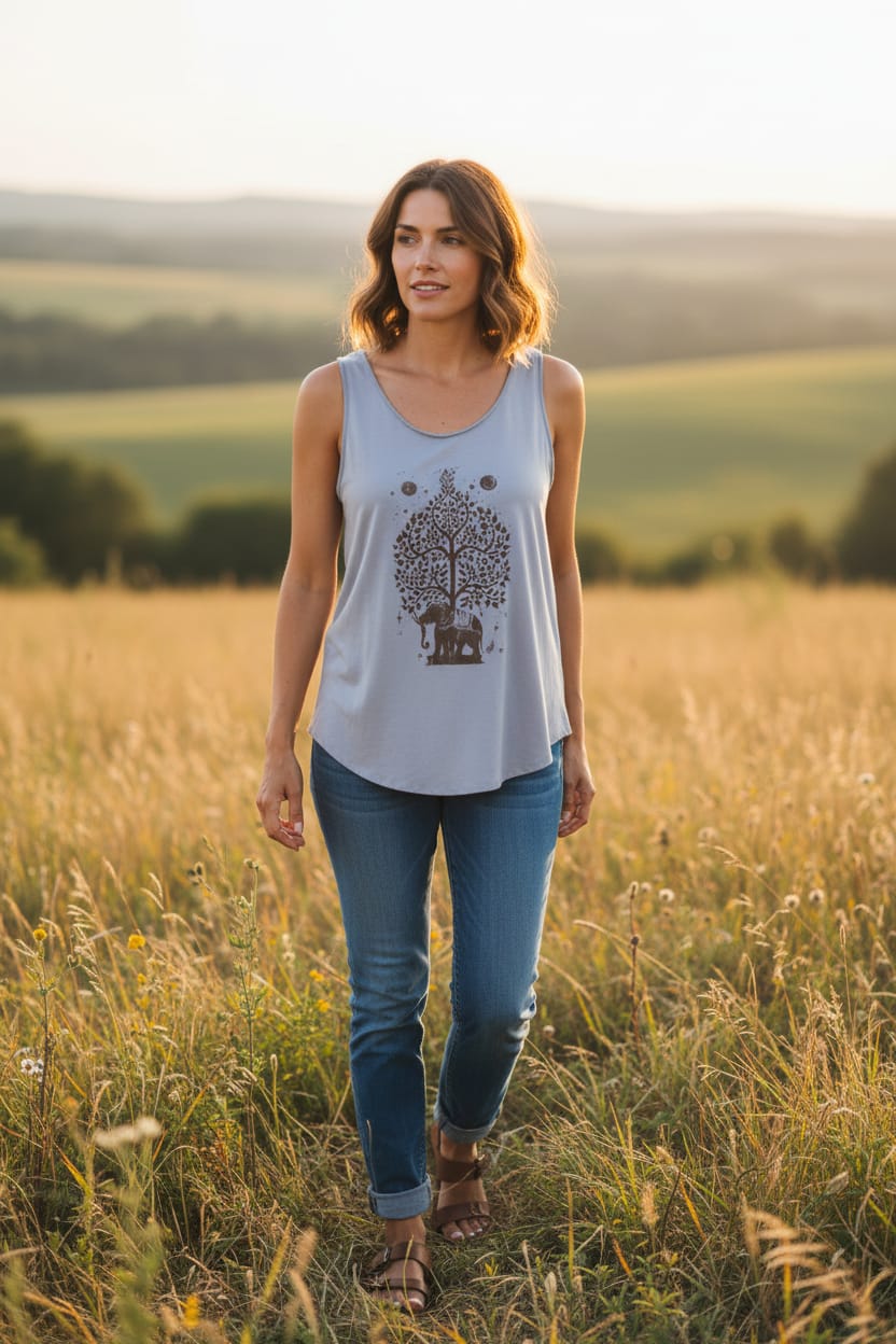 Dominantným prvkom je potlač stromu života, symbol sily, rovnováhy a prepojenia s prírodou, ktorý dodáva topu jedinečný spirituálny a etno charakter. Vďaka univerzálnej veľkosti sa top prirodzene prispôsobí rôznym typom postáv a poskytuje voľnosť pohybu.