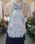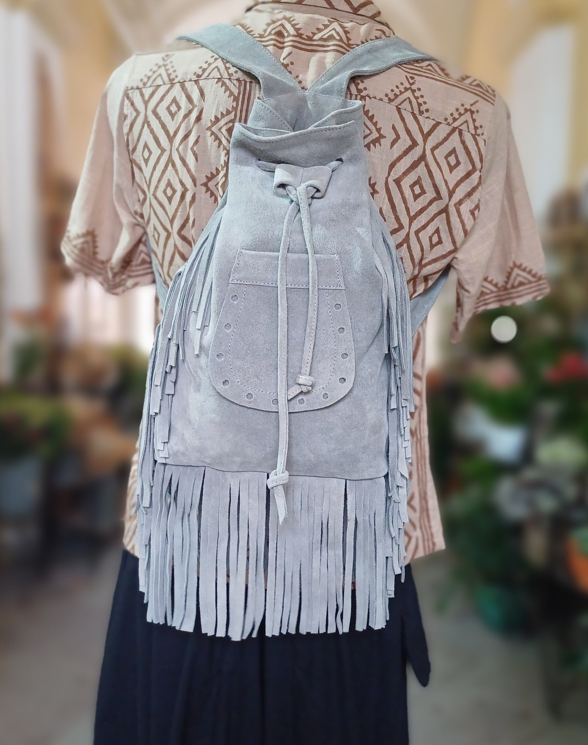 Originálny kožený etno ruksak Bohemian je ručne vyrobený z kvalitnej jemnej brúsenej kože, disponuje nastaviteļnými ramenami, malým vreckom na prednej strane a jedným vnútorným vreckom so zipsom. Ruksak sa uzatvára sťahovacou koženou ŝnúrou na vrchnej časti. Ruksak je zdobený po stranách jemnými strapcami, čo mu dodáva originálny a autentický bohémsky vzhľad. Ak hľadáte výnimočný a zároveñ praktický doplnok na každý deñ, ruksak Bohemian sa stane vaším obľúbeným kúskom.